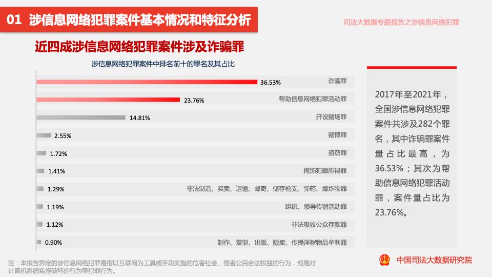 報(bào)告顯示,2017年至2021年,全國各級法院一審審結(jié)的涉信息網(wǎng)絡(luò)犯罪案件共計(jì)28.20萬余件,案件量呈逐年上升趨勢。案件共涉及282個(gè)罪名,其中詐騙罪案件量占比最高,為36.53%;其次為幫助信息網(wǎng)絡(luò)犯罪活動(dòng)罪,案件量占比為23.76%。