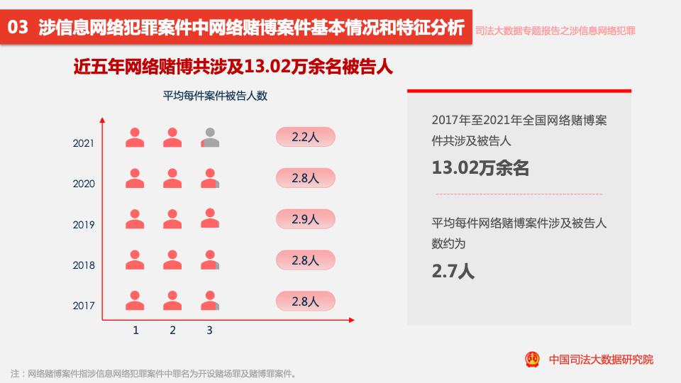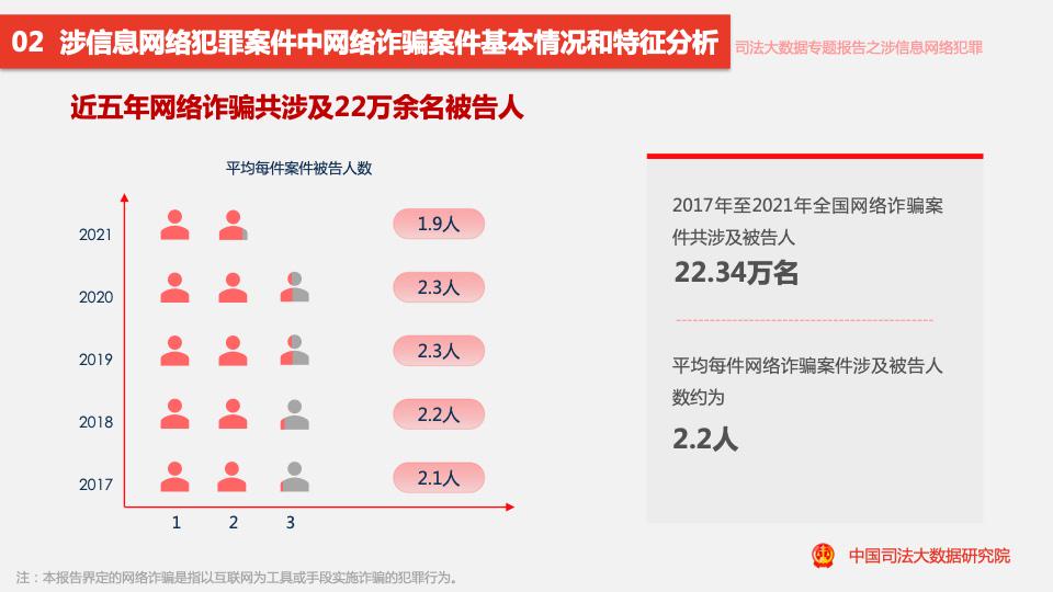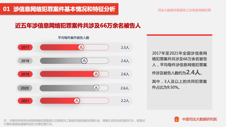 五年來,全國涉信息網(wǎng)絡(luò)犯罪案件共涉及66萬余名被告人,平均每件案件涉及被告人數(shù)約為2.4人。其中,3人及以上的共同犯罪案件占比為9.50%。