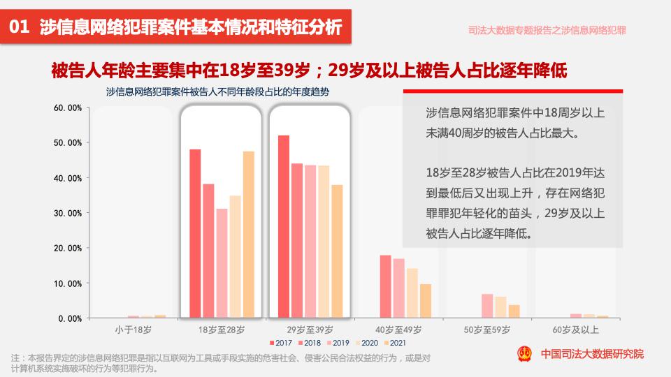 報(bào)告顯示,在涉信息網(wǎng)絡(luò)犯罪案件中,18周歲以上未滿40周歲的被告人占比最大。18歲至28歲被告人占比在2019年達(dá)到最低后又出現(xiàn)上升,存在網(wǎng)絡(luò)犯罪罪犯年輕化的苗頭,29歲及以上被告人占比逐年降低。