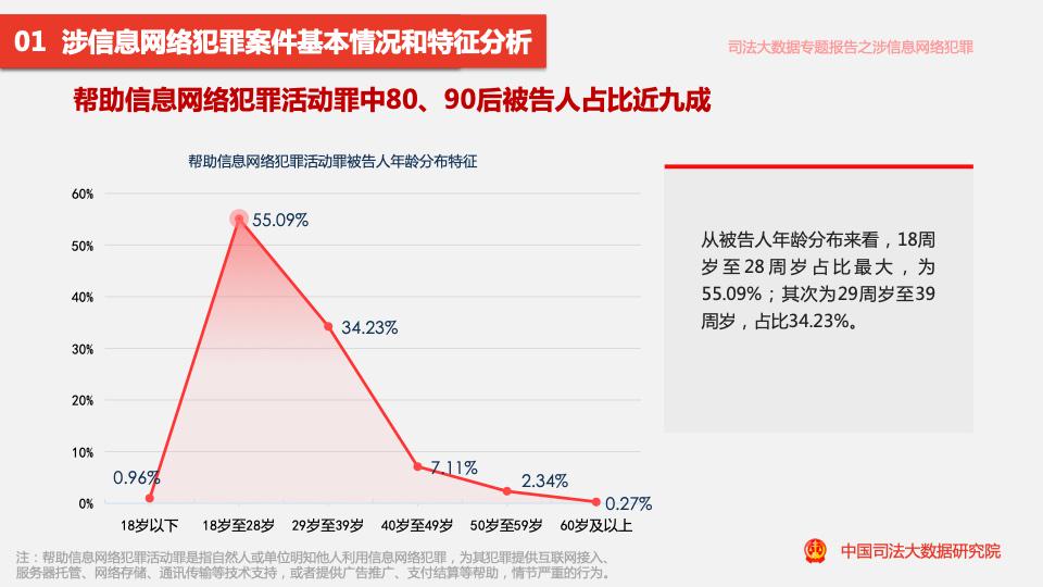 五年來,全國幫助信息網(wǎng)絡(luò)犯罪活動(dòng)罪案件涉及被告人共計(jì)14.37萬人。從被告人年齡分布來看,“80后”“90后”被告人占比近九成。其中,18周歲至28周歲人群占比最大,為55.09%;其次為29周歲至39周歲人群,占比34.23%。