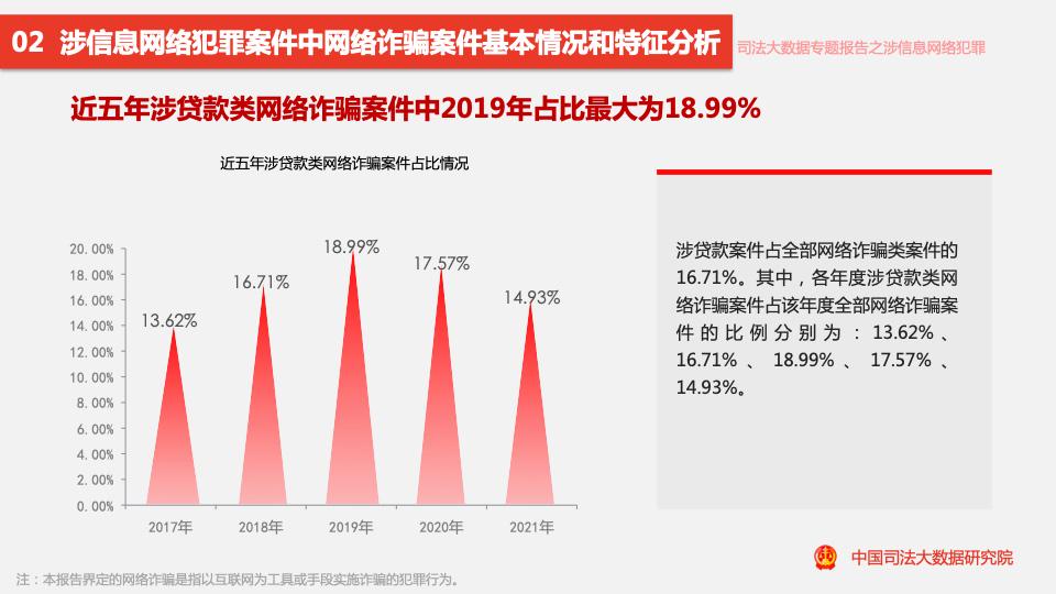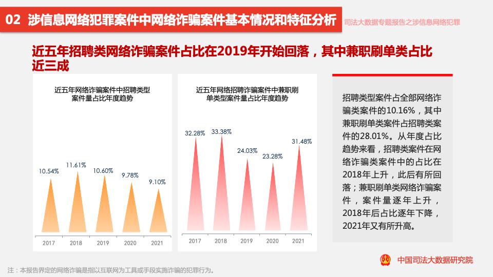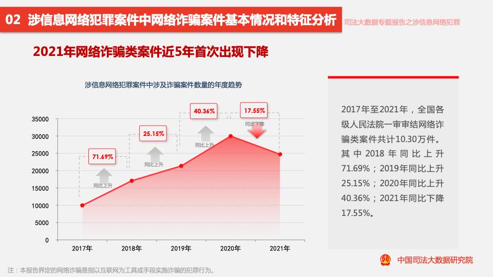 報(bào)告顯示,2017至2021年,涉信息網(wǎng)絡(luò)犯罪案件數(shù)量呈逐年上升趨勢,近四成案件涉及詐騙罪,2021年網(wǎng)絡(luò)詐騙類案件量同比下降17.55%,是近5年來首次下降。